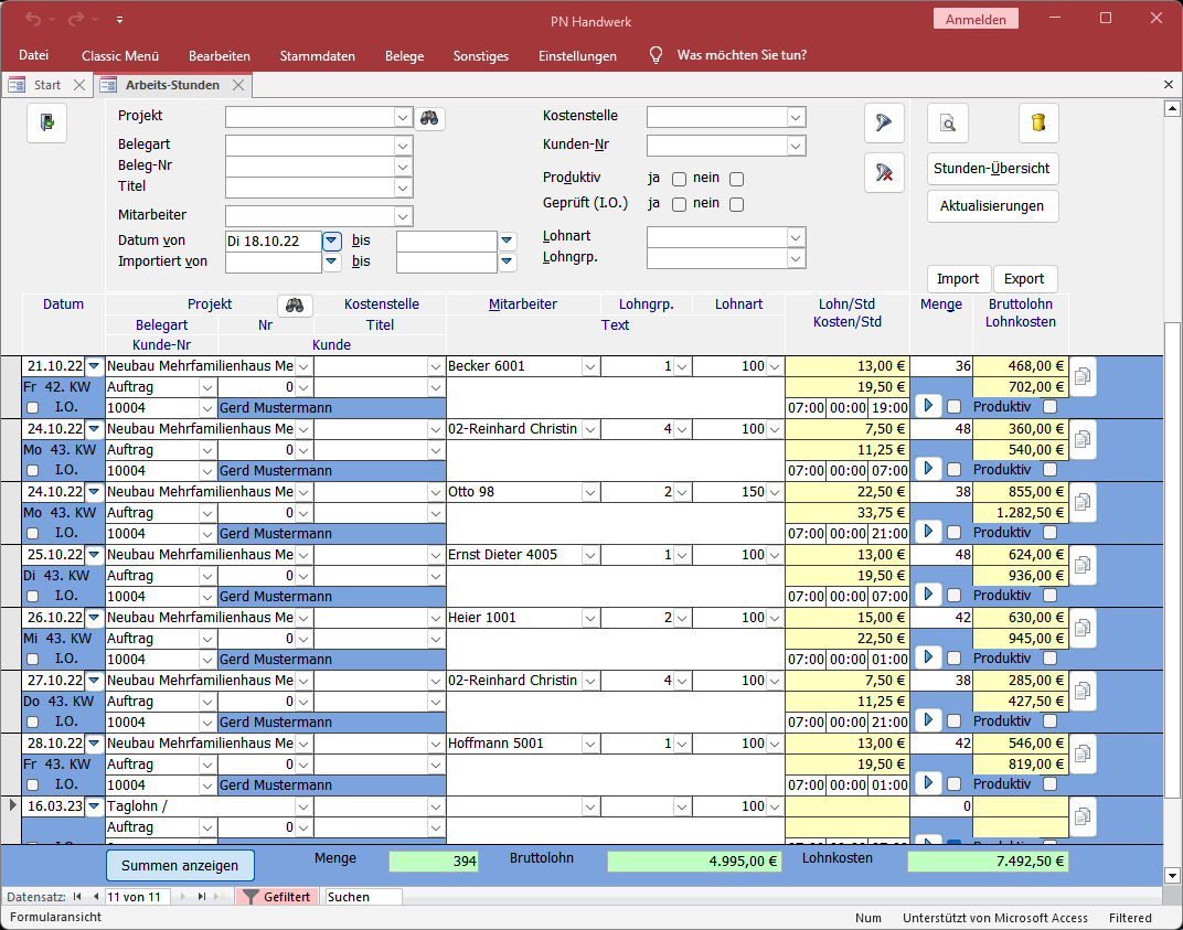 - Arbeitsstunden pro Mitarbeiter mit Kunde und Objekt