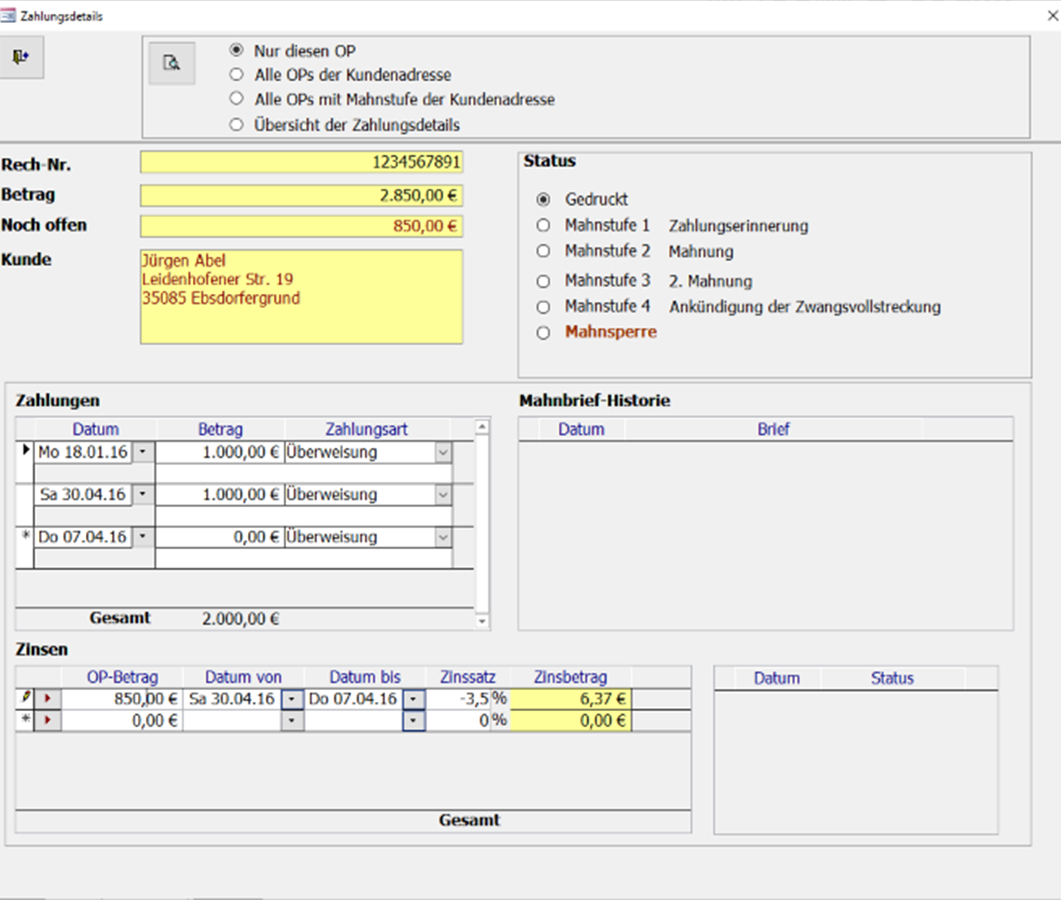 - Übersicht der einzelnen Mahnstufen mit Summen.