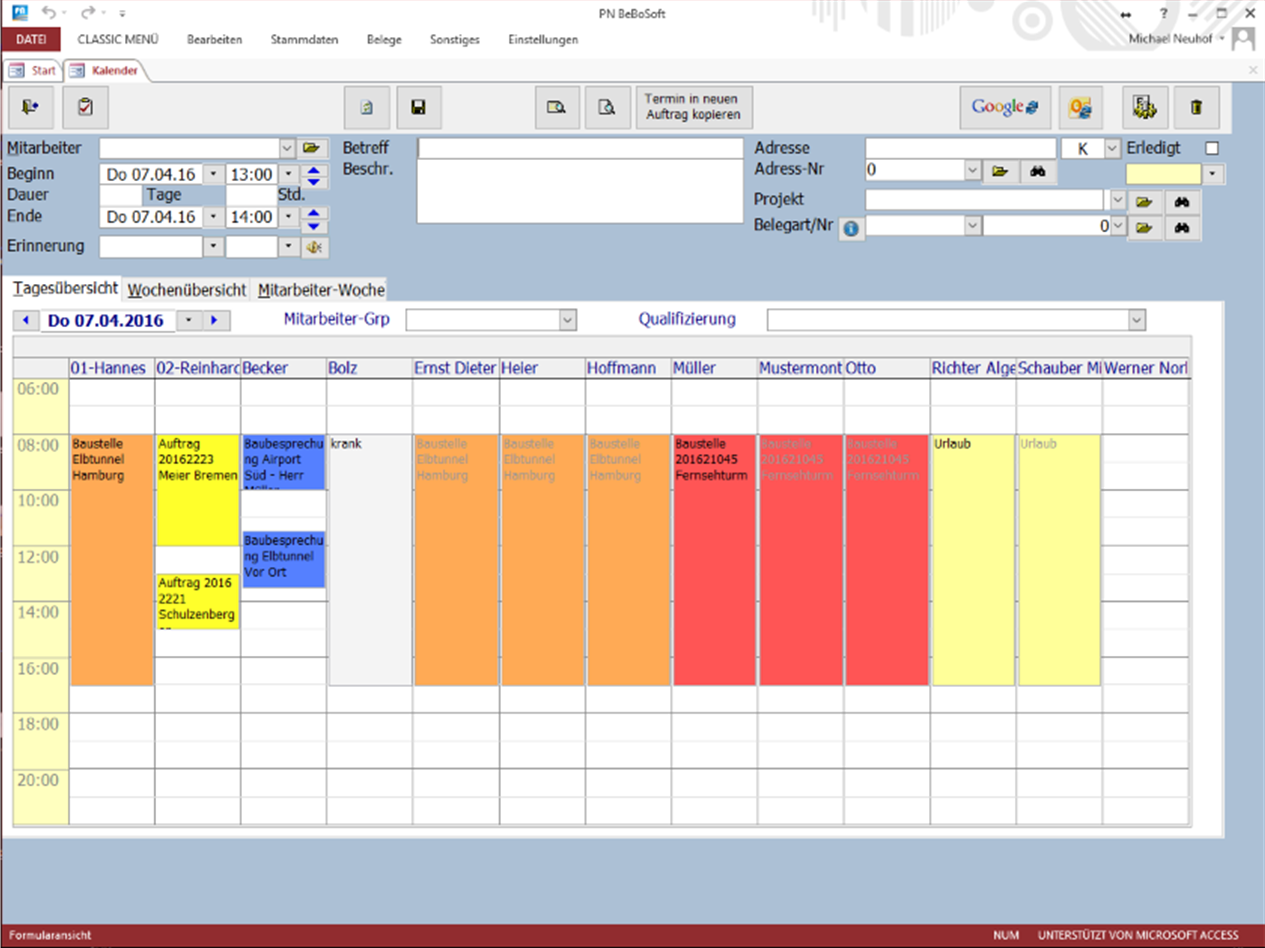 Die Zeitplanung des einzelnen Mitarbeiters im Tagesablauf zu erfassen und zu optimieren, wird durch den in PN BeBoSoft verfügbaren netzwerkfähigen Terminkalender vereinfacht.