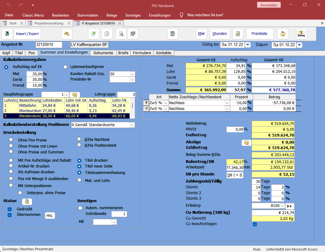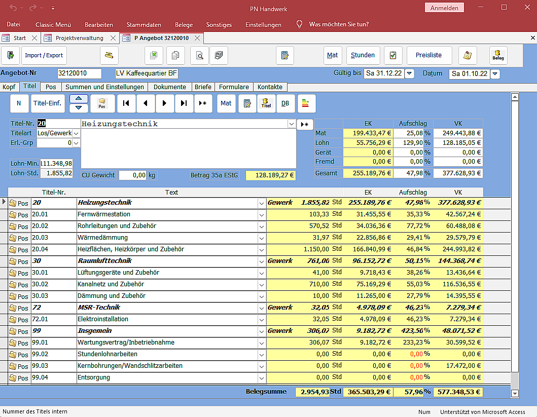 - Titelsummen können direkt überschrieben werden, die im Titel vorhandenen Positionspreise werden proportional angepasst