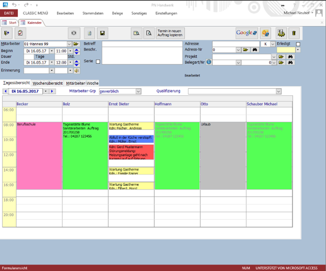 Zusätzlich bietet Ihnen der Bereich Taglohn die Möglichkeit, telefonische Aufträge sofort zu erfassen, dabei die Verfügbarkeit der Mitarbeiter zu prüfen und Ihrem Kunden direkt einen sicheren Termin zu nennen. Hierfür steht Ihnen ein intelligenter netzwerkfähiger Termin- und Aufgabenkalender zur Verfügung.
