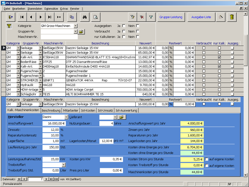 PN BeBoSoft bietet Ihnen die Möglichkeit, Ihre Werkzeuge und Maschinen innerhalb des Systems zu erfassen und zu verwalten. Dadurch erhalten umfangreiche Auswertungen zu den einzelnen Werkzeugen und Maschinen, die als Grundlage für Ihre Angebotskalkulation oder Auftragsnachkalkulation dienen können. Die Zuordnung der Leistungen auf die einzelnen Werkzeuge und Maschinen erfolgt automatisch bei der Rechnungserstellung.